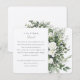 Diese Umschließungskarte ist die perfekte Ergänzung zu einer Hochzeitssuite, die mit einem seitlichen Strauß aus weißen Rosen und einer abwechslungsreichen Vegetation in Eukalyptus-, Meeresfrüchte- und Oliventönen zaubert. Es ist ein ideales Stück, um diese "feineren Details" Ihres besonderen Tages zu teilen, von der Richtung bis zu den Geschenkvorlieben. Die gepflegte Gestaltung der Karte mit eleganter Typografie bietet eine anmutige Möglichkeit, alle zusätzlichen Informationen, die Ihre Gäste benötigen, zu vermitteln und so ein nahtloses Erlebnis für Ihre sorgfältig geplante Veranstaltung zu gewährleisten.