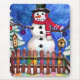 Original Aquarellmalerei von Sandra Gale eines Schneemanns, der vor einem Picketzaun stehend ist, mit leuchtenden Weihnachtslichtern, die den Winterschnee abstrahlen. Vögel, Vogelhäuser und Weihnachtsschmuck machen das zu einer klassischen Weihnachtslandschaft, die auf Papier, Weihnachtskarten und vielem mehr großartig aussieht!