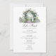 Dieses elegante Hochzeitsmenü im Garten besticht durch einen Blumenbogen und einen Springbrunnen mit individualisierbarer grauer Typografie. Romantisches, elegantes Hochzeitsdesign.