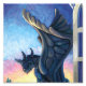 Gargoyle Guardian Art von Traci Van Wagoner druckt, posters, accessoires und gifts zeigt einen blau-grauen Steingargoyle, der Sie von seiner Terrasse hoch über der Stadt am frühen Morgen mit einem strukturierten Sonnenaufgang aus gelb, orange, rosa, violett und blau anschaut. Holen Sie sich heute einen Gargoyle-Wächter, um eine Uhr für Sie behalten.