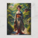 Maiden of the Green Garden - (Midori no Sono no Otome) - Dieses Kunstwerk zeigt eine Einzelfrau in traditioneller japanischer Kleidung, einen Kimono, der durch einen gewundenen Steinweg in einem üppigen Garten spaziert. Ihr Kleid besteht aus einem Mix aus weichen Grüntönen, abgestuften Grauen und tiefen Rottönen mit subtilen Blumenmustern. Sie trägt einen kleinen, gewebten Korb, gefüllt mit scheinbar roten Blume.