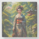 Maiden of the Green Garden - (Midori no Sono no Otome) - Dieses Kunstwerk zeigt eine Einzelfrau in traditioneller japanischer Kleidung, einen Kimono, der durch einen gewundenen Steinweg in einem üppigen Garten spaziert. Ihr Kleid besteht aus einem Mix aus weichen Grüntönen, abgestuften Grauen und tiefen Rottönen mit subtilen Blumenmustern. Sie trägt einen kleinen, gewebten Korb, gefüllt mit scheinbar roten Blume.