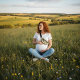 Eine Frau reflektiert friedlich in ihrem Garten