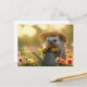 Ein bezaubernder Igel mit Strohhut und Gartenhandschuhen, der auf einem Tränkchen steht, kann sich in farbenfrohen Gängen in einem sonnenbeleuchteten Feld der Blume vergnügen. Ideal für Natur- und Wildtierfreunde, die nach whimsical Inspiration suchen.