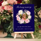 Ein Gästebuch für eine Gedenkfeier oder Beerdigung. Ein klassisch dunkelblauer Hintergrund mit einem rosa und weißen Kranz aus Blumen. Personalisieren und hinzufügen eines Fotos, Namens und Datums.