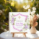Ein weißer Hintergrund. Rosa Wappen, rosa und lila Blumen, Blumen. Mit einem goldenen Kreuz. Personalisieren und fügen Sie einen Namen und ein Datum hinzu. Kann als Gästebuch oder für die Planung der Veranstaltung verwendet werden.