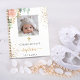 Für eine elegante Taufe. Weiße, schick wirkende Dekoration mit einer Rose aus Rose und Rosa, Eukalyptusgrün, vergoldetem Glitzer aus Imitaten und goldenem Kreuz. Personalisieren und fügen Sie ein quadratisches Foto auf der Vorderseite, den Namen des Kindes und das Datum der Taufe. Schwarze und goldene Buchstaben. Zurück: Fügen Sie Ihre eigenen 3 Fotos auf der Rückseite, Name und Geburtsdatum hinzu. Bilder in vertikaler Größe (Porträtgröße)