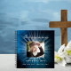 Ein Gästebuch für eine Gedenkfeier oder Beerdigung. Ein blauer Himmel als Hintergrund. Weiße Lichtstrahlen hinter dem Foto. Personalisieren und hinzufügen eines Fotos, Namens und Datums. Weiße Buchstaben.