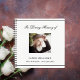 Ein Gästebuch für eine Gedenkfeier oder Beerdigung. Ein weißer Hintergrund, ein schwarzer Rahmen vorne. Personalisieren und hinzufügen eines Fotos, Namens und Datums. Schwarzer Text.