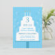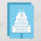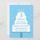 Une invitation bleue avec des ballons et un gâteau blanc avec les bougies allumées. Le texte montre à l'intérieur de l'espace du gâteau pour un amusement et un invitation instructif. L'arrière - plan sur l'avant de la carte a un motif de rayure bleue.