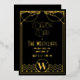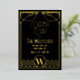 Die ultimative Eleganz für Ihr Party- oder Pferderennuhr-Party. Goldfolienpferde und ein Deko Gatsby Stil mit Vintager Typografie. Ihr Monogramm mit Zickzack Wellen ist Teil des eleganten Designs. Roaring 20 bei den Rennen. Eine klassische und spektakuläre Einladung zu Ihrem wunderbaren glamourösen Event. Schwarzer Hintergrund mit Goldfolie.