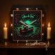 Eine rustikale und stilvolle Abbildung eines Jägers in einem Boot auf einem See. Das Kunstwerk hat eine geflochtene Textur und der Hintergrund ist eine Mischung aus dunklen, erdigen Tönen und lebhaften Neontönen. Der Jäger wird mit einem Gewehr gezeigt, und mehrere Enten sind rund um den ruhigen See verstreut.