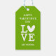 Ein romantisches und zeitgenössisches Valentinstag-Geschenkschild mit dem Wort "Liebe" in einem modernen, weißen Schriftart mit einem niedlichen Herz für den Buchstaben "o" über einem schlichten apfelgrünen Hintergrund. Sie können den Tag ganz einfach personalisieren, indem Sie Ihren Text und Ihren Namen an der Vorderseite und Ihre persönliche Nachricht an der Rückseite hinzufügen. Alle Farben und Texte können leicht personalisiert werden. Auch geeignet für andere besondere Veranstaltungen wie Geburtstage, Hochzeitsfeiern und vieles mehr.