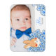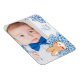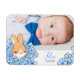 Elegante Geburtsanzeige mit Magnet, Foto und Zeichnung eines niedlichen Hasen und Blumen. Ideal, um ein unvergessliches Andenken für die ganze Familie und Freunde zu schaffen.