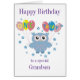 Brillen Geburtstagskarte für Großeltern- JNR Design Baby Owl Serie Eine moderne Geburtstagskarte für stolze Großeltern, mit einer niedlichen kleinen Eule, die Ballons ins Party bringt. Feiern Sie Ihre besonderen Enkel 1. Geburtstag mit einer Schüssel! Das Innere der Karte wird leer verlassen, um Ihnen genügend Platz zum Schreiben Ihrer persönlichen Nachricht zu geben.
