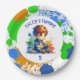 Personalisierter Name und Geburtstagsfeier Teller. Niedlicher kleiner Anime-Junge, der Videospiele mit blauem, orangefarbenem und grünem Spritzer abspielt, der in einer Aquarellbild-Illustration erstellt wurde.