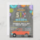 Mechanisches Thema mit Abhol-LKW und Reifen und farbenfrohe Banner, Werkzeuge, und Zahnräder und Zahnräder Hintergrund Druck-Design Geburtstagseinladungskarte.