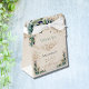Weißer Hintergrund mit Eukalyptusgrün und goldenen Blätter und Imitaten goldener Glitzer Staub. Personalisieren und fügen Sie einen Namen und Alter. Mit dem Text: Danke.