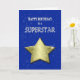 Eine Geburtstagkarte für einen Superstar. Ein großer goldener Stern, der das Zeitalter trägt, schwimmt im Himmel. Im Hintergrund blinken Sterne. Eine tolle Geburtstagskarte für jemanden, der etwas ganz Besonderes ist.