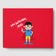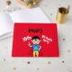 Cartoon Charakter Super Held zeigt auf die Anzahl seiner Geburtstage. Auf der Rückseite zeigen sie auf das Datum.