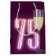 Auf dem Hintergrund des Mords mit einem Glas Wein zum 75. Geburtstag steht ein leuchtendes rosa 75 Neonzeichen. Die Farbe des Hintergrunds kann geändert werden.