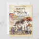 Lade deine Freunde und Lieben ein und feiere den 3. Geburtstag deines Kindes mit dieser Safari-Geburtstagsfeier, die eine afrikanische Savanne-Landschaft im Hintergrund und eine Gruppe von Kleintieren beinhaltet, die einen Tigercub, Elefanten, Nashorngestein, Straußenchick, Zebra und Storch im Vordergrund umfasst.