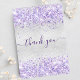 Ein weiblicher und eleganter Geburtstag Dankeschön Karte. Ein Imitat silber aussehende Hintergrundfarbe. Mit lila, violetten Imitaten Glitzer, Glitzern. Auf der Vorderseite große Hand Schrift und der Text: Danke. Zurück: Personalisieren Sie Ihre Dankeschön Notiz und Name. Der Name wird mit einem modernen handgeschriebenen Stilskript mit Swashes geschrieben.