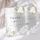 Ein moderner und eleganter Geburtstag Dankeschön Karte. Ein Imitat silber aussehender Hintergrund. Weiße Rosen, Blume mit Blumenmuster und Spitzen. Auf der Vorderseite den Text: Danke. Zurück: Vorlage für Ihren Dank Notiz und Name.