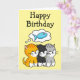 Wünschen Sie jemanden einen guten Geburtstag mit dieser bezaubernden Karte. Drei bezaubernde Kätzchen, die hintereinander sitzen, einer ist ein Ingwer-Tabby, der andere ein schwarz-weißer Smoking und der dritte ein kleines graues Kätzchen. Sie alle denken gerne an den leckeren blauen Fisch, den sie zum Tee haben werden. Der Hintergrund ist eine hellgelbe Farbe.