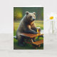 Großer Bär sitzt an einem Picknicktisch mit einer Tasse Bier zum Geburtstag. Text ist bearbeitbar.