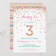 Feiern Sie Ihren 3-jährigen Geburtstag mit bunten Gold, Rosa, Minze und aquamarinen Konfetti bei diesen Einladungen zum 3. Geburtstag! Mit den Party-Details Ihrer Tochter und ein "3" in Konfetti. Titel lautet "Hooray, Yippee" Niedliche farbige passende Streifen auf der Rückseite. Dieses bezaubernde Design ist super niedlich und mädchenhaft.
