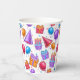 Ein buntes Geburtstagsfeier-Papierbecher-Muster mit Partyhüten, Luftballons und Cupcakes