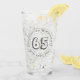 Geburtstagsfeier Glas mit dem Namen der Person und das Datum ihres Geburtstages. Ein Glas für jemanden, der 65 ist. Stil der Kontur.