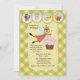 Eine whimsical Fee, ein Kuchen und Bilder von Spielzeug sind vorgestellt, um diese Geburtstagseinladung zu schaffen, die einen karierten gelben und grünen Hintergrund hat. Niedlich und süß wie möglich.Die Karte ist leicht anzupassen mit Ihrem Wortlaut, Schriftart, Schriftart Farbe und Auswahl von sechs Papiertypen.