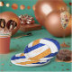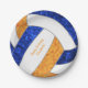 Die 7" Teller der Volleyball-Geburtstagsparty der Girls sind mit einer gürtelblauen, orangefarbenen und weißen Volleyballgrafik mit individualisierbarem "Happy Birthday"-Gruß und Mädchennamen versehen. Die blau-orangefarbenen Volleyballfelder des Volleyballs sind mit einem hübschen, kaleidoskopischen Muster vermischt, die weißen Volleyballfelder mit einem abstrakten wirbeln künstlerisch und gürtelig - von katz_d_zynes