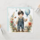 Die Karte feiert den Geburtstag eines kleinen Jungen, der 1. Es bietet Blume, Kuchen und Schmetterlinge; die Rückseite hat eine kleine Version des Vorderbildes und viel Platz, um eine Nachricht zu schreiben. AI Bing hat bei der Erstellung der Karte geholfen.