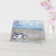 Ein blauer Motorrad stehend auf einem Strand mit flauschigen Wolken am Himmel. Alles Gute zum Geburtstag geschrieben in Stein reflektiert im Wasser auf dem Sand.