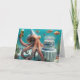 Ein Oktopus mit einem Party, das ein Bier hält und neben einem Geburtstagskuchen unter Wasser sitzt. Text kann geändert werden.