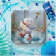 Ein fröhliches Entlein mit roten Stiefeln spritzt fröhlich in einer Pfütze und hält dabei eine Zahl 7 Gold Geburtstagsballon.