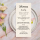 Geburtstagsmenü Karte. Personalisieren und fügen Sie einen Namen, Alter, Datum und das Menü. Beigefarbener Hintergrund. Schwarze Buchstaben. Zurück: Fügen Sie ein Foto des Geburtstagsmädchens hinzu, lustige Fakten und Namen.