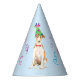 Glückliche Geburtstagsgrüße mit diesem niedlichen Design mit einem lächelnden, Party-Hut-Hut-Welpe Borzoi umgeben von bunten Streamern.