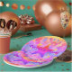 Geburtstagsparty-Teller mit Gelb, Orange, Rosa, lila und anderen Farben, Sternen und Blasen, Ihrem Kind den Namen und den Worten "Happy Birthday! Koordination von Tassen und Servietten separat verkauft. Designed by HAMbyWhiteGlove. alias HAMbyWG.