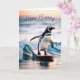 Niedlicher Pinguin auf Surfbrett und Meereswellen. Text kann bearbeitet werden.
