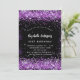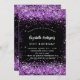 Eine moderne, stilvolle und glamouröse Einladung für eine 21. Geburtstagsfeier (oder jedes Alter). Ein schwarzer Hintergrund mit lila Konfetti. Der Name ist mit einem modernen handgeschriebenen Stilskript geschrieben. Personalisieren Sie Ihre Party-Daten und fügen Sie sie hinzu.