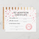 Dieses "Adoption-Zertifikat" ist für die Geburtstagsfeier Ihres Kindes! Es ist ein neuerer Trend, ein Imitate Adoption Center Set, wo Kinder Zuhause gestopfte Tiere nehmen können! Dies wird ein lustiges "offizielles" Zertifikat, um in Ihrem Imitat Adoption Center zu geben. Es lasse dem Kind seinen Namen und den Namen des Tieres auszufüllen. Es ist in Rosa. Karo auch das Zeichen "Adoption Center", das sich in der gleichen Sammlung befindet wie dieses Element.