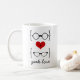 Niedliche und skurrile Geeky-Brille-Tasse mit rotem Herz, flankiert von zwei geeky-Brillen, einem männlichen Paar und einem gürtelhaften Paar. Diese süße Tasse eignet sich hervorragend, um Ihr Lieblingsgetränk mit einem nerdigen Flair zu genießen! Einfach zu anpassen, fügen Sie einfach den personalisierten Text Ihrer Wahl. Klicken Sie auf "Anpassen", um weitere Personalisierungsoptionen zu erhalten.