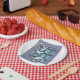 Eine Gefängnisbar mit einem Set Handschellen. Dieses Design sieht wirklich effektiv aus bei diesen Paper-Tellern