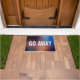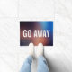 Lustige nicht-bestimmt-freundliche Fußmatte mit GEHEN WEG geschrieben in große mutige weiße Buchstaben über Braunem und Blau.