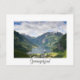 Carte postale du fameux fjord Geirangerfjord, paquebot de croisière et village de Geiranger entre les montagnes de Norvège avec une frontière blanche et le texte : 'Geirangerfjord'.