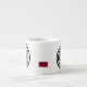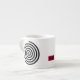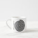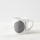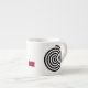 Weiße Espressotasse mit einem Bild, auf beiden Seiten, von der Spirale des Geistes und dem Text "Spiral des Geistes" in schwarzem Schriftsatz. Das kleine rote Rechteck zwischen ihnen enthält die chinesischen Zeichen für Frieden und Liebe.